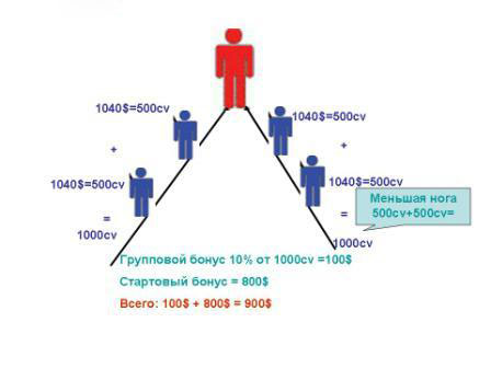 меньшей. И у него чек: (стартовый бонус) 800$ + (групповой бонус) 100$ =